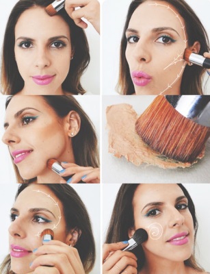 С помощью нанесения тонального крема различных оттенков обычно меняют овал лица для придания ему более изящной формы и немного выправляют контуры с помощью эффектов затемнения или осветления. При отсутствии определенного опыта необходимо обратиться к специалисту. Иногда тональный крем наносят только местами. Все зависит от строения лица и состояния кожи.