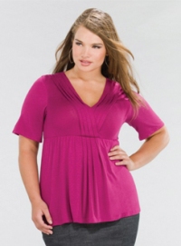 - Крой: одна из самых важных характеристик топа для полных женщин. В идеале топ должен отличаться трапециевидным (А-образным) кроем – так называемый стиль baby-doll, предусматривающий завышенную линию талии, проходящую чуть ниже грудь. Топы с таким кроем выглядят очень красиво, кокетливо и женственно, подчеркивают соблазнительную пышность груди и одновременно скрывают выступающий животик. Для повседневного гардероба или создания ансамбля для вечеринки такие топы станут идеальным вариантом.